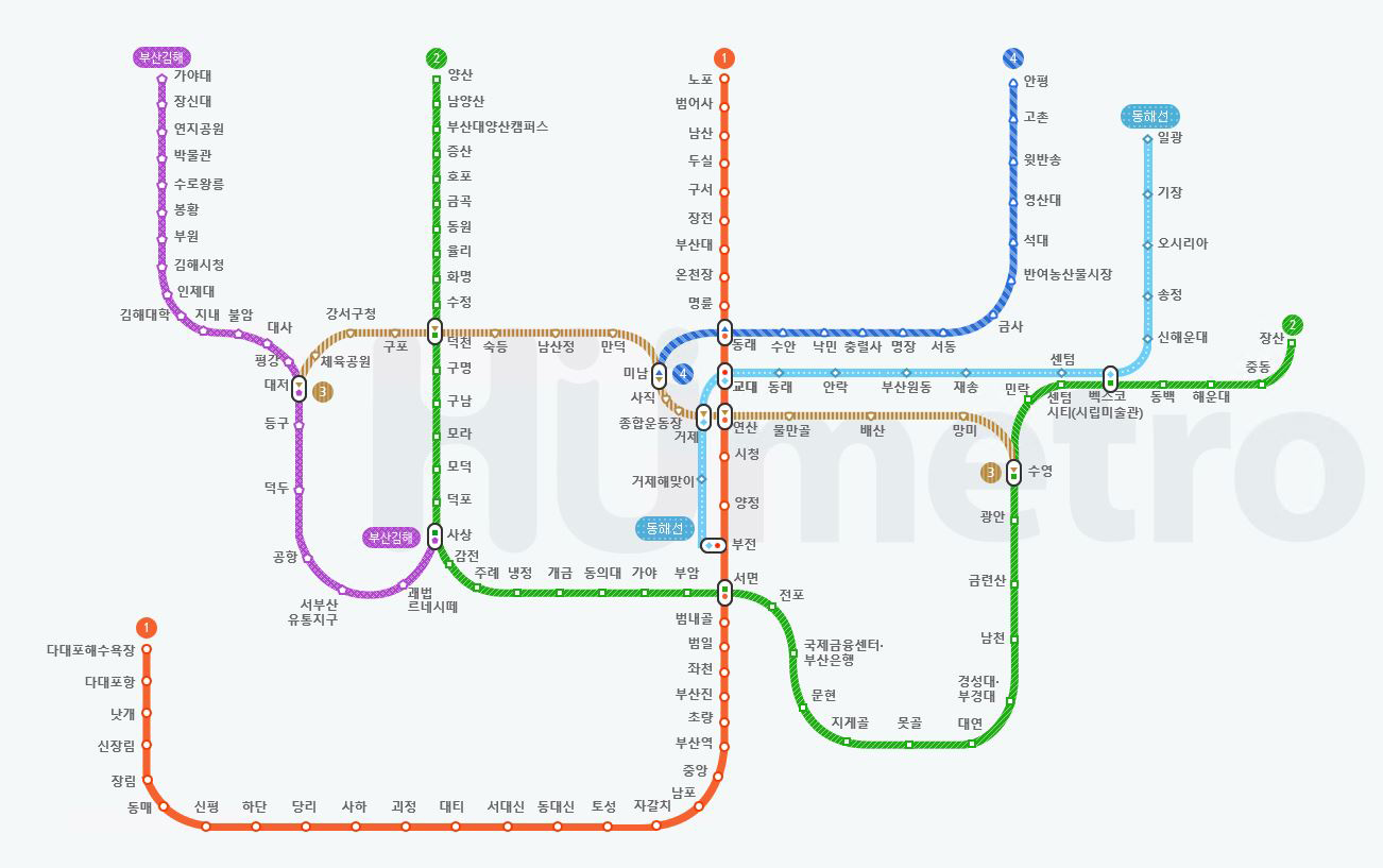 부산 지하철은 1호선부터 4호선까지 총 4개의 주요 노선으로 구성되어 있으며, 동해선과 김해경전철을 포함하면 부산 전역을 커버하는 광범위한 교통망을 자랑합니다. 부산 지하철 각 노선은 고유한 색상으로 구분되어 있어 초보자도 쉽게 구별할 수 있습니다.